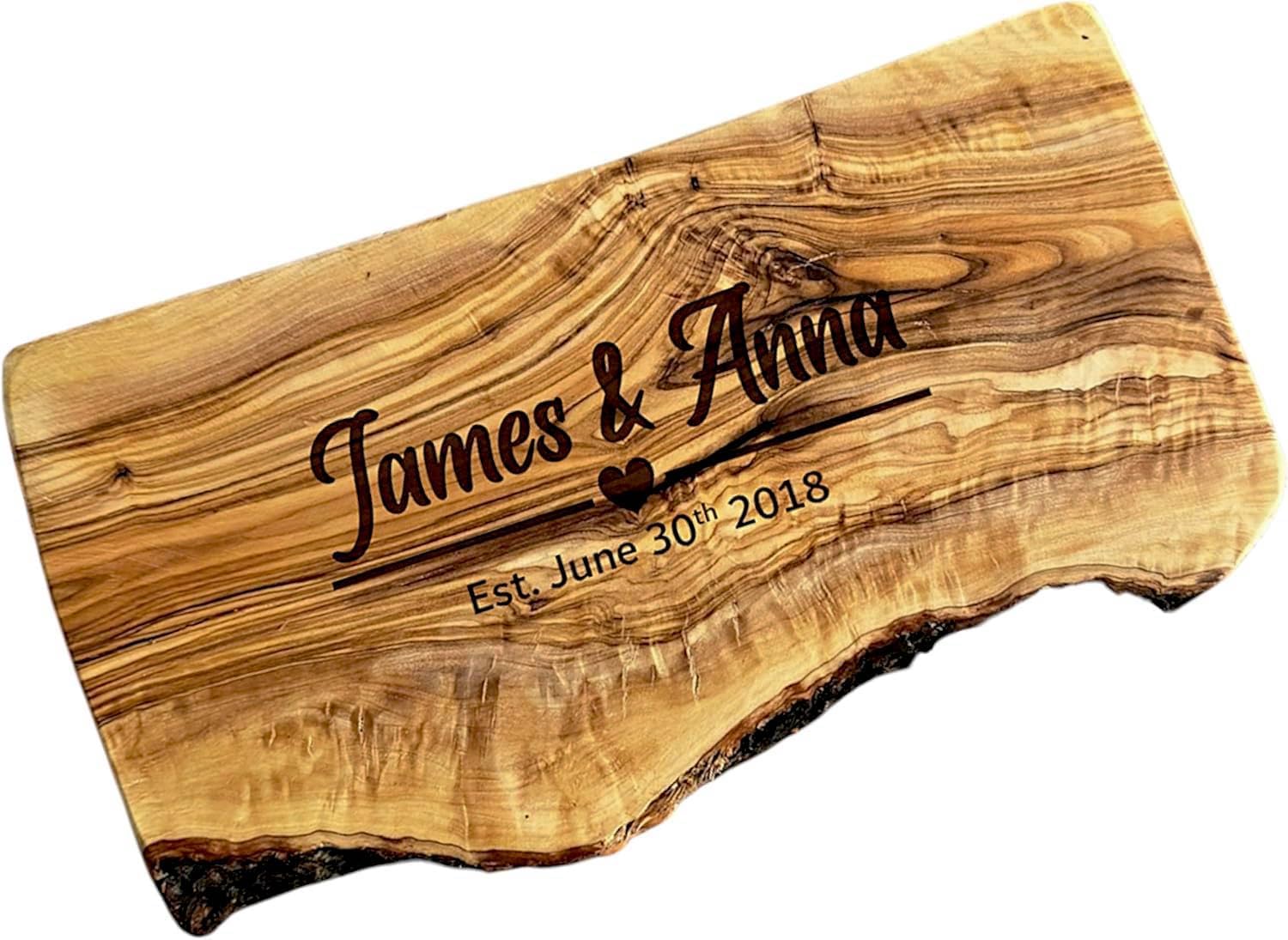 Handcrafted from olive wood and engraved with their initials and date, this rustic board is both useful and deeply sentimental.